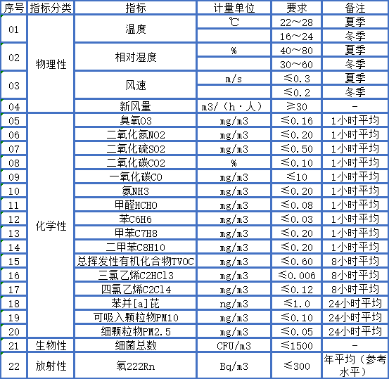 隨著經濟技術的發展,人們生活水平的提高,人們逐漸要提高和改善自己的居住和工作環境,在對居住環境、辦公樓進行裝飾裝修時必然要采用大量的建築和裝修材料,在美化室內環境的同時也帶來了大量的汙染物,這些室內環境中存在的汙染物具有成分複雜、低濃度、接觸時間長、影響人群眾多和產生健康影響的效應潛伏期長等特點。為了保護室內人群的身心健康和促進員工的工作效率,國內外各單位和機構投入大量精力和財力進行研究和實施達到室內人群可接受的室內汙染物水平的措施和管理程序,為創造良好的樓宇室內環境質量,針對室內汙染的控製要素主要有:物理性指標、化學性指標、生物性指標和放射性指標四大類,各主要要素的控製限值詳見下表(摘自《室內空氣質量標準》):